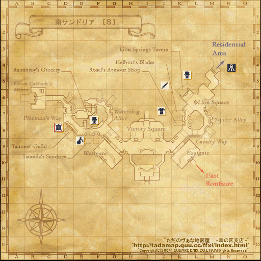 味方駐留場所は5箇所。凱旋門広場北、凱旋門広場南、チョコボ厩舎前、モグハウス前、カッファル邸前。