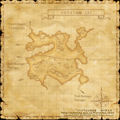 エリア担当の神勇督戦団「Vaa Oozu the Redolent」は前衛系(恐らく戦士)で、サソリを最大二匹召喚する。 RedolentとサソリはWSが連動しており、3体が密集した状態でのコールドブレスや大暴れは非常に危険。 サソリが倒されると2匹となるまで際限なく召喚される。 メリファトは、東西に伸びる崖、その下の道、断崖に架かる橋状の地形が特徴的。 敵は原則としてこの崖の上り下りをしないらしく(ヘイトをもったPCが崖下に移動した場合等は追うが、マラソンで橋を利用する場合、崖の上り下りで近道をしたりすることはない)、さまざまに利用される。 マップ南部(ドロガロガの背骨以南)に棲息するサソリは、獣使いのペットとして利用される場合がある。 進軍ルートの近辺にPixieが極めて少ないのも特徴。